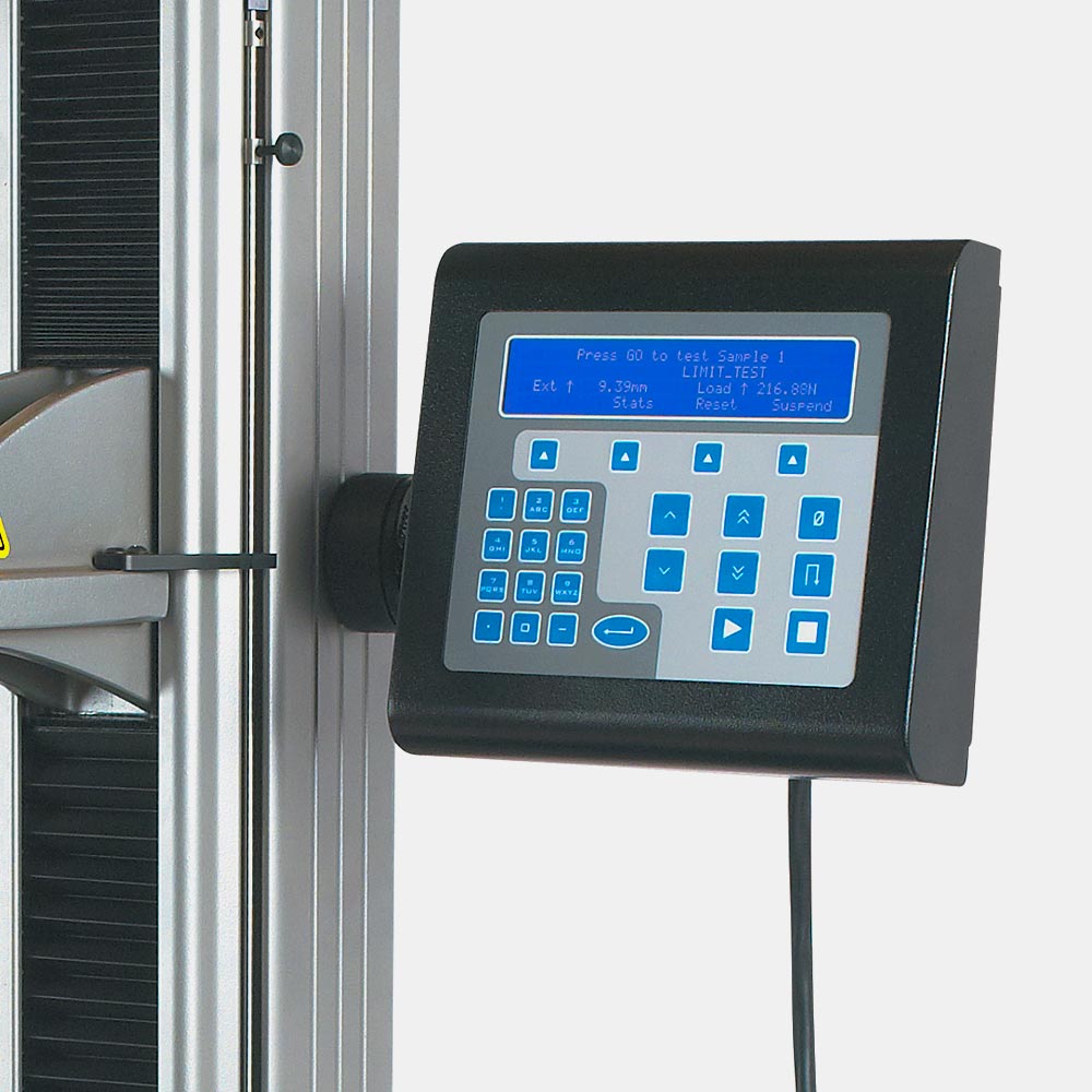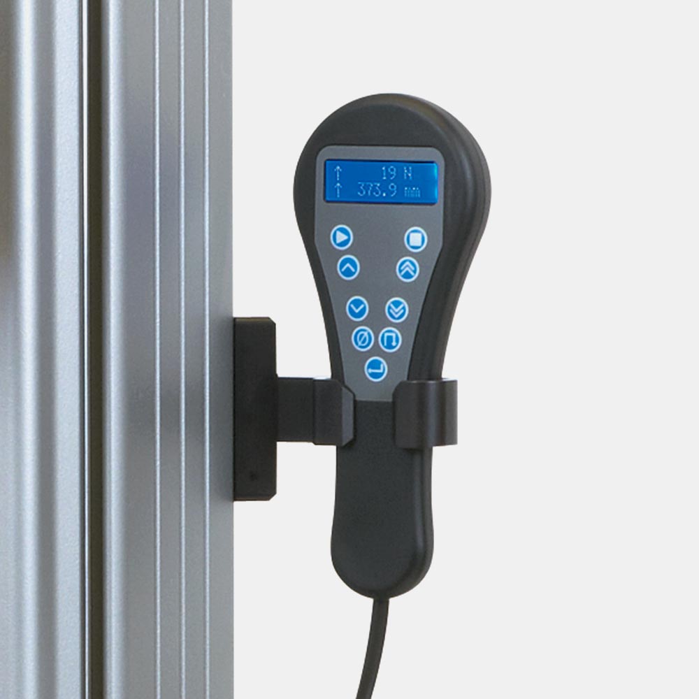 Vengono fornite di serie con un telecomando di azionamento posto al lato della traversa dotato di display digitale che svolge le funzioni di start e stop, movimento e accostamento. In alternativa, si può scegliere la consolle di comando opzionale, dotata di robusta tastiera a membrana impermeabile e display digitale LCD ad alto contrasto a quattro righe, con rappresentazione dei messaggi in lingua italiana, utile per la configurazione dei parametri della prova e per l’utilizzo della macchina senza software.