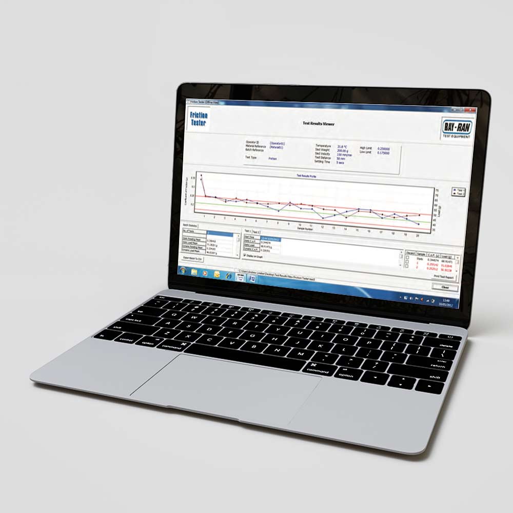 Techni-Test è un pacchetto software facile da usare fornito con l’avanzato Friction Tester a controllo computerizzato Ray Ran, che consente all’operatore di monitorare e definire tutti i parametri del test e di scaricare automaticamente i risultati della prova per l’analisi del coefficiente di attrito statico e dinamico.
